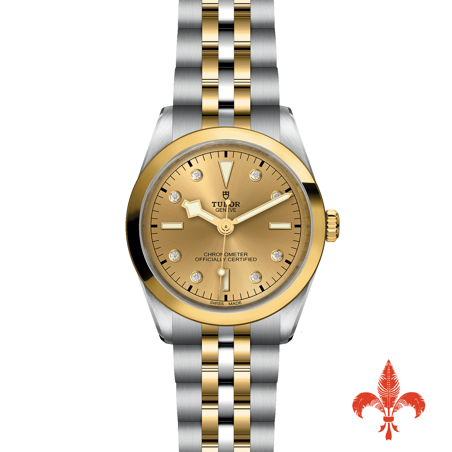 First center links in steel or solid yellow gold. Remaining centre links are made of a steel core capped with 0.2mm of yellow gold. TUDOR "T-fit" folding clasp with safety catch. The logo on the catch is made of solid yellow gold.